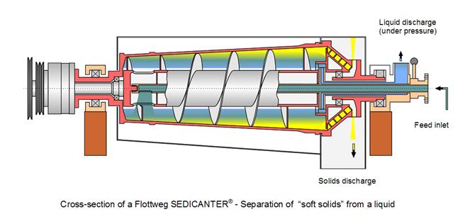 The SEDICANTER® is essentially a decanter centrifuges but with some novel differences. As for ordinary decanters, the feed enters the bowl through a central feed pipe. Through ports in the scroll body, feed passes into the bowl where separation by centrifugal force takes place. The differences are in the drive and the internal design. The drive is able to impart very high g-forces (as high as 10 000 g) facilitating the separation of very fine, slow-settling solids. The shape of the bowl gives the SEDICANTER® a much longer clarification zone than the standard decanter. A uniquely designed feed distributor and bowl seal prevent foaming in the product inlet zone. The cleaning-in-place provisions available for the SEDICANTER® meet pharmaceutical industry standards.